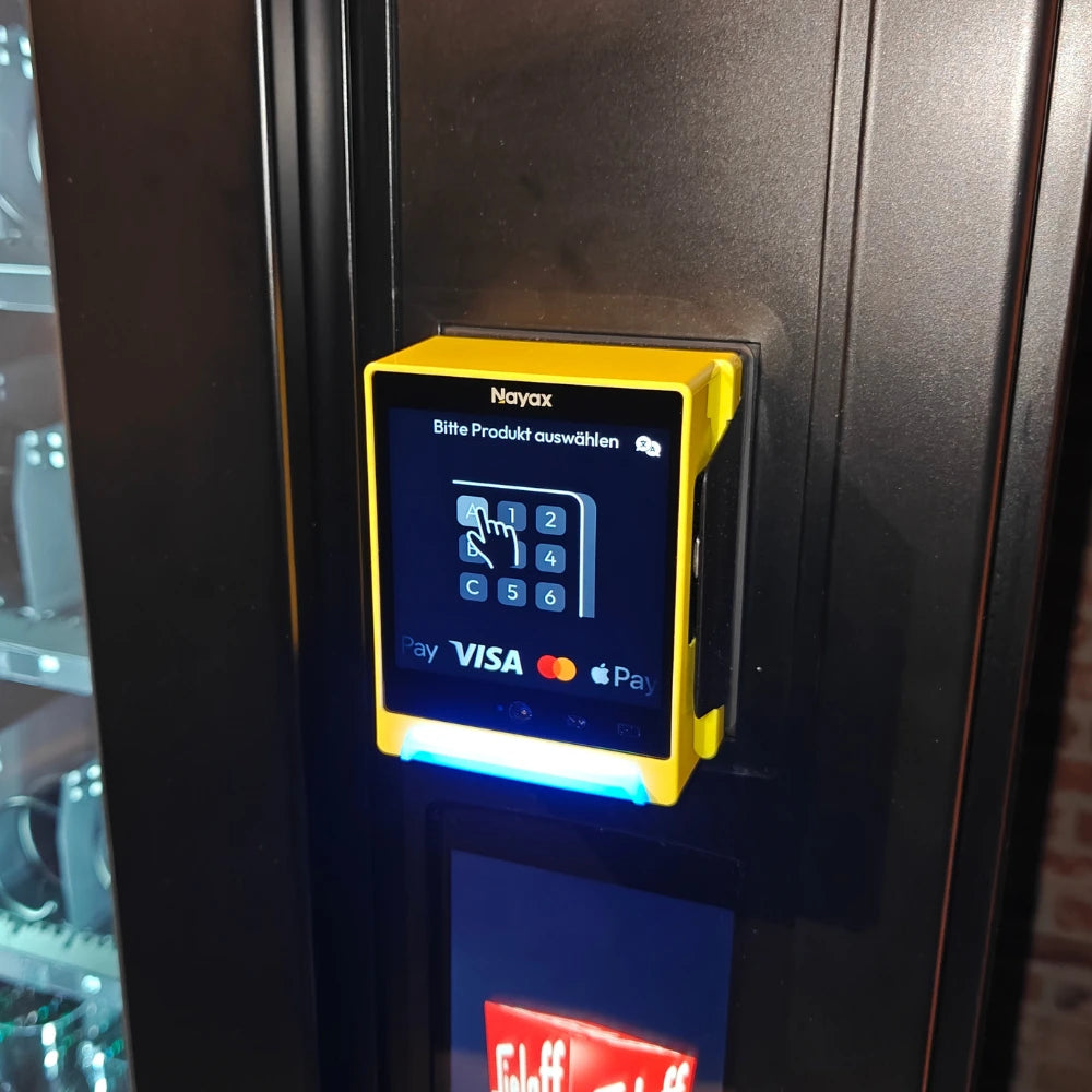 Das Nayax VPOS Media 4 Bezahlsystem macht den Automaten vollständig cashless und digital über eine SIM-Karte verbunden. Kunden zahlen einfach mit Apple Pay, Google Pay, Debitkarte oder Kreditkarte. Schnell, sicher und benutzerfreundlich.