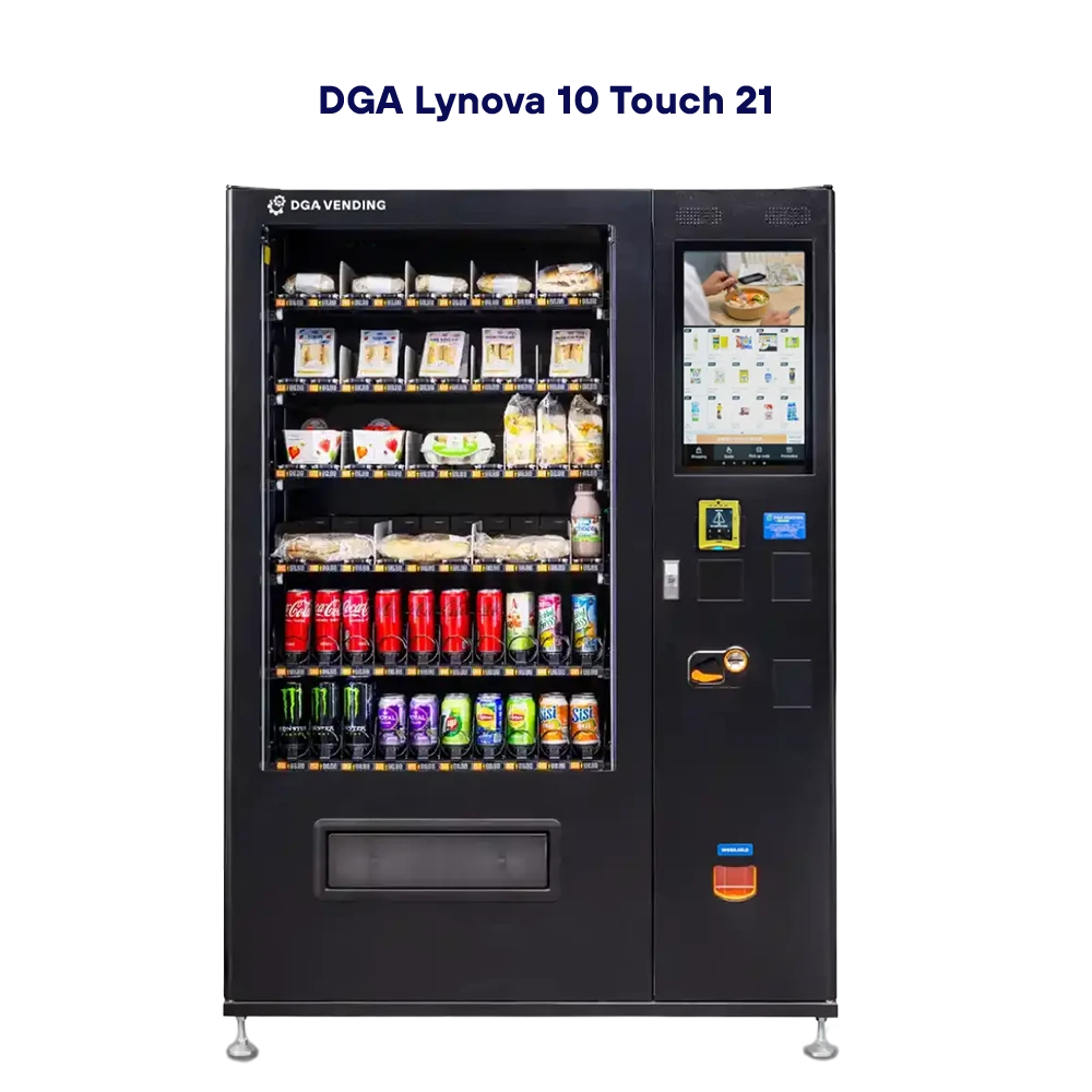 Der DGA Lynova 10 Touch 21.5 ist ein vielseitiger Kombi-Verkaufsautomat, der sich für Snacks, Getränke und empfindliche Produkte eignet. Dank seines hellen 21,5-Zoll-Touchscreens und des durchdachten Rollenbandsystems bietet dieser Automat eine intuitive und benutzerfreundliche Bedienung.DGA Lynova 10 Touch Outdoor