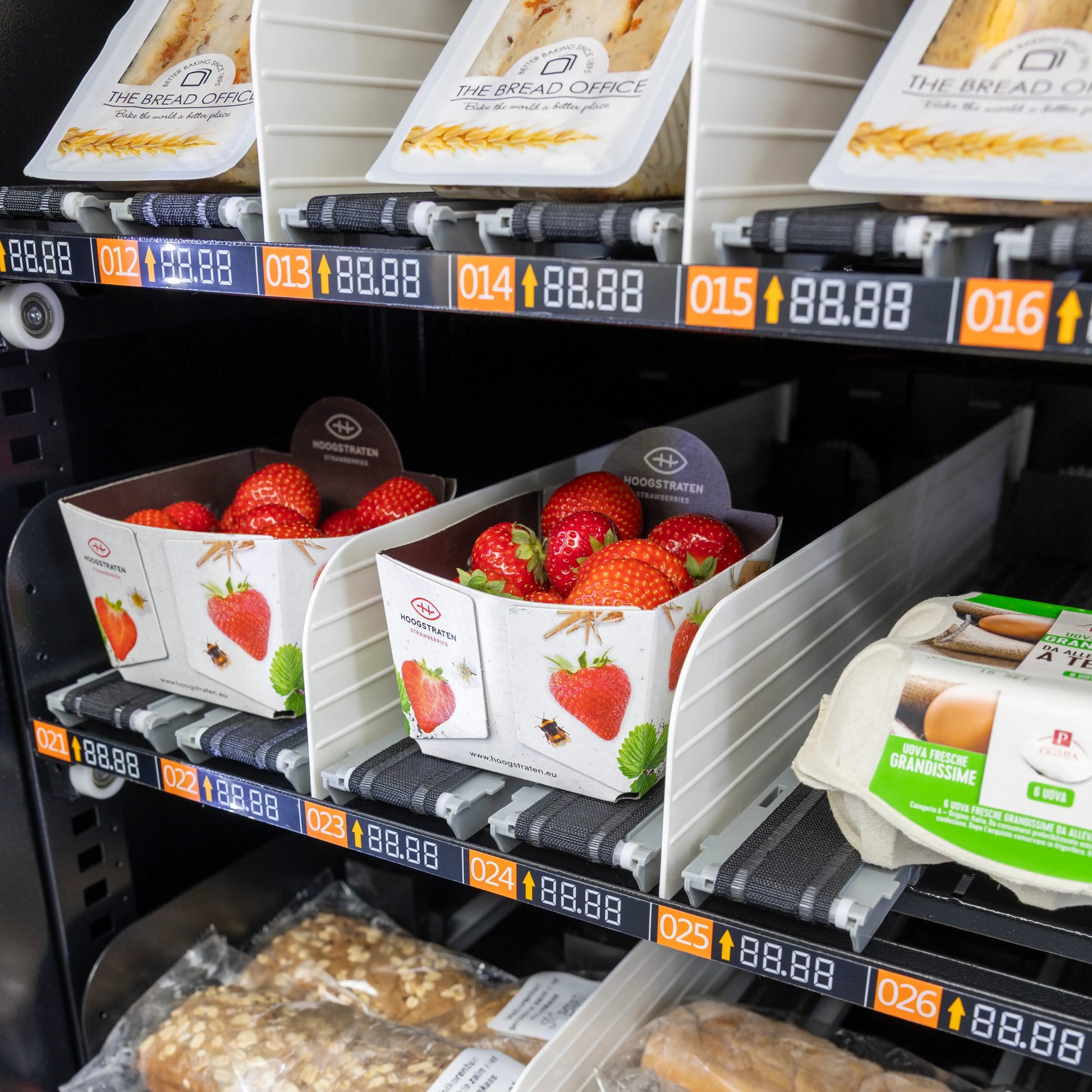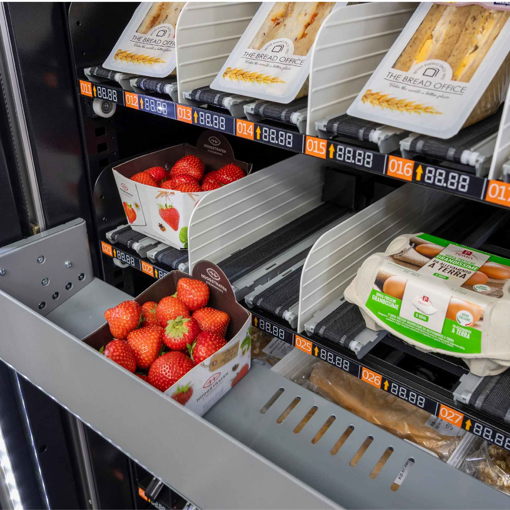 Dankzij de speciale rollerbanden kan de automaat producten van uiteenlopende vormen en afmetingen uitgeven. Van smalle flesjes tot ronde verpakkingen, alles past.